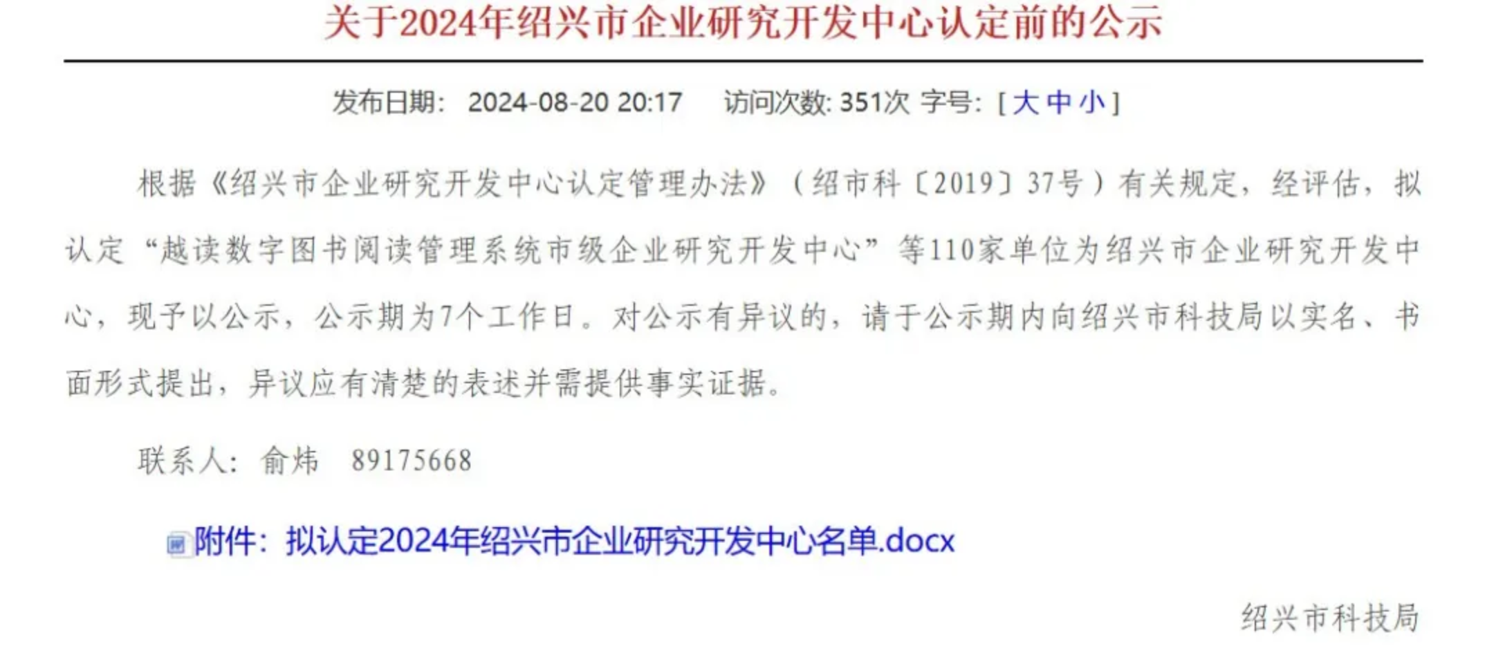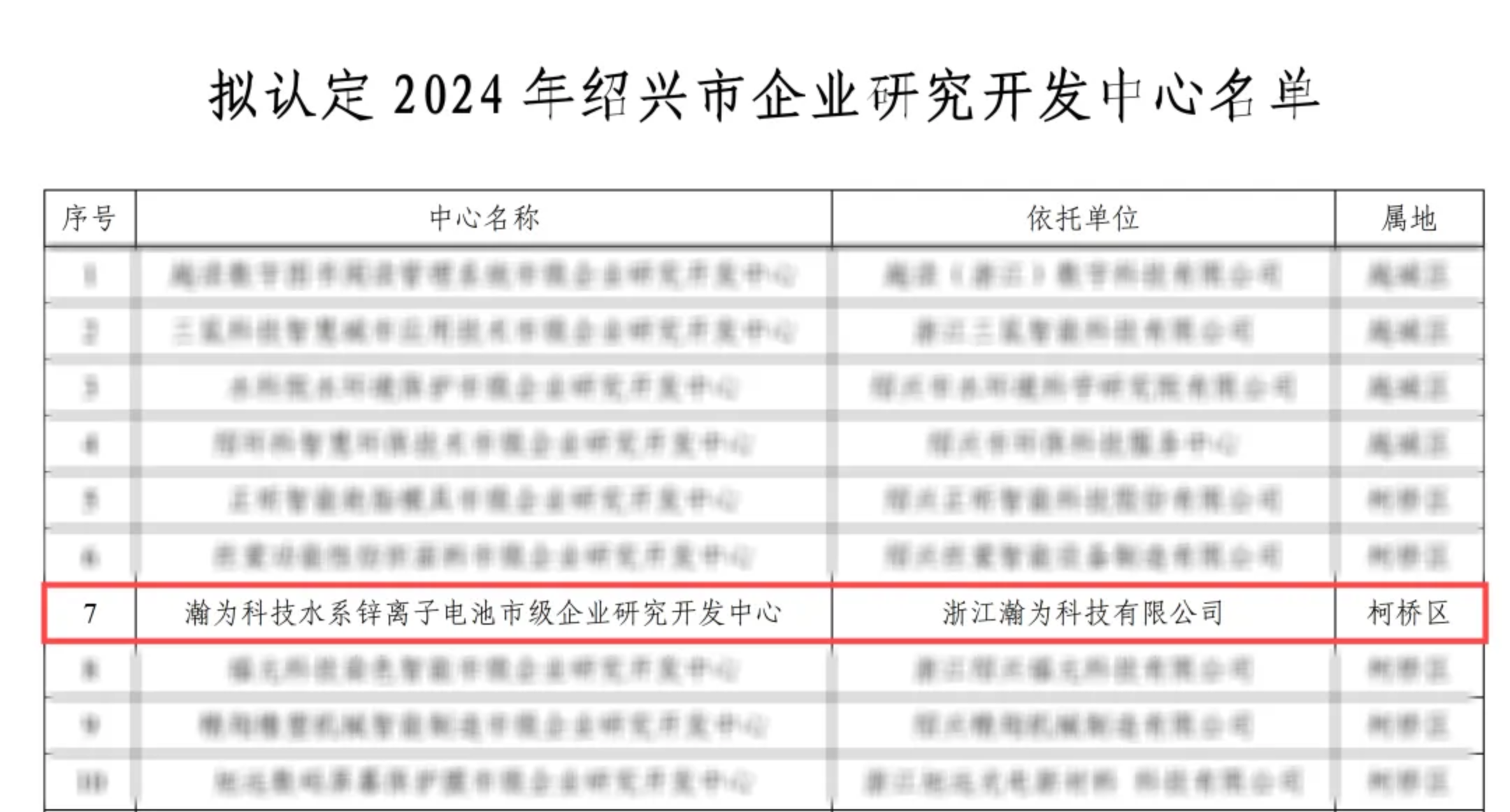 2024年8月20日,绍兴市科学技术局发布《关于2024年绍兴市企业研究开发中心认定的通知》。浙江瀚为科技的“瀚为科技水系锌离子电池市级企业研究开发中心”获得了“2024年绍兴市企业研究开发中心”的认定。