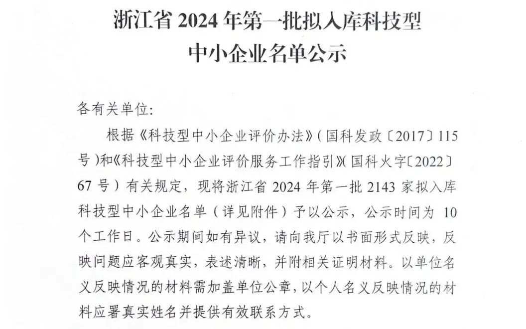 2024年8月,浙江省经济和信息化厅公布了《浙江省2024年第一批拟入库科技型中小企业名单》,根据《科技型中小企业评价办法》(国科发政[2017]115号 )和《科技型中小企业评价服务工作指引》国科火字[2022]67号)有关规定,浙江瀚为科技凭借新型储能技术创新成功入库,成为浙江省科技型中小企业。
